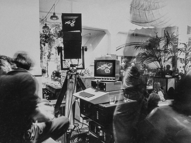 Jeffrey Shaw, Theo Botschuijver, „Virtual Sculpture“, 1981, Pan- und Tilt-System auf Stativ, halbdurchlässiger Spiegel, Fresnel-Linse, 12" S/W CRT-Monitor, Apple II Gamepaddles, Apple II Plus, 175 x 71,6 x 79,6 cm, Ausstellungsansicht im Melkweg, Amsterda