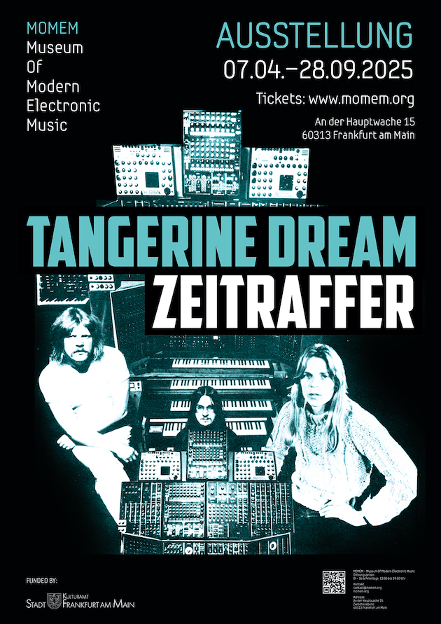 FrankfurtTangerine Dream Zeitraffer ab 7.4.2025 Tangerine Dream gelten nicht nur als eine der international einflussreichsten deutschen Bands aller Zeiten, sondern auch als die wohl produktivsten Pioniere und Inspiratoren elektronischer Musik, insbesondere für deren Spielarten Ambient und Trance. Vom 7. April an würdigt das MOMEM mit der erstmals in Deutschland gezeigten Ausstellung Tangerine Dream: Zeitraffer die außergewöhnliche und wechselhafte Geschichte der Band, die 1967 in West-Berlin ihren Anfang nahm und mit dem Tod ihres Gründers Edgar Froese im Jahr 2015 noch lange nicht zu Ende war. Denn „es gibt keinen Tod“, war Froese überzeugt, „es ändert sich nur die kosmische Adresse.“ Anhand zahlreicher Dokumente, Fotos und Original-Instrumente (u.a. Prophet-5, Moog IIIP und Minimoog) erzählt die eigens für das MOMEM neu zusammengestellte und erweiterte Ausstellung Tangerine Dream: Zeitraffer einige der wichtigsten Stationen in der über 55-jährigen Bandgeschichte. Die Basis dafür bildet die gleichnamige Ausstellung, die 2020 in der Library des Londoner Barbican Center gezeigt wurde. In der Frankfurter Werkschau kann natürlich auch die Musik von Tangerine Dream intensiv gehört und erlebt werden, im Zusammenklang mit rarem Bildmaterial und den vielen Zeitdokumenten, die Bianca Froese-Acquaye gesammelt und – unterstützt von Co-Kurator Christian Arndt – für das MOMEM aktualisiert und neu eingeordnet hat.